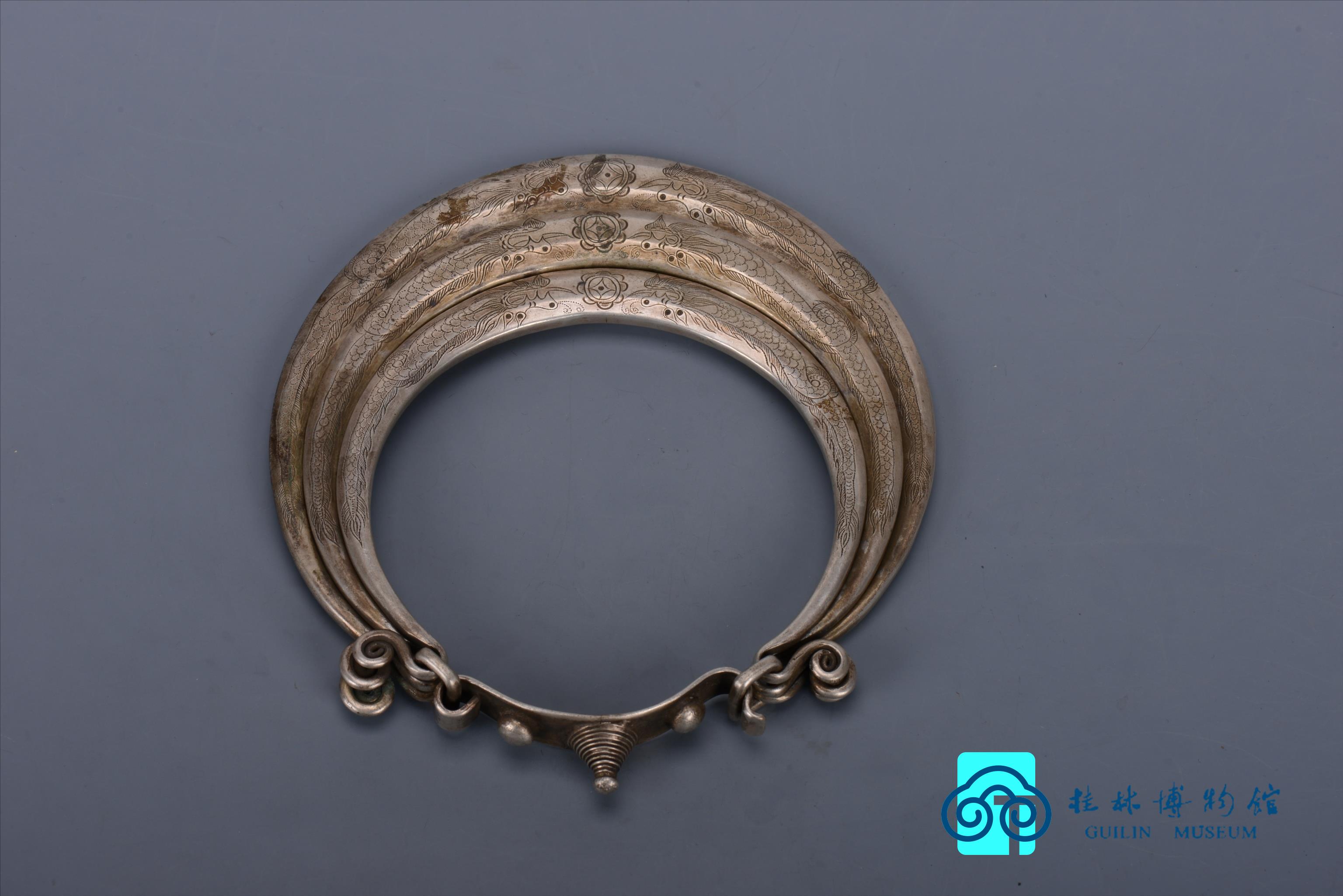 清广西三江侗族双龙抢珠纹錾花三穿银项圈