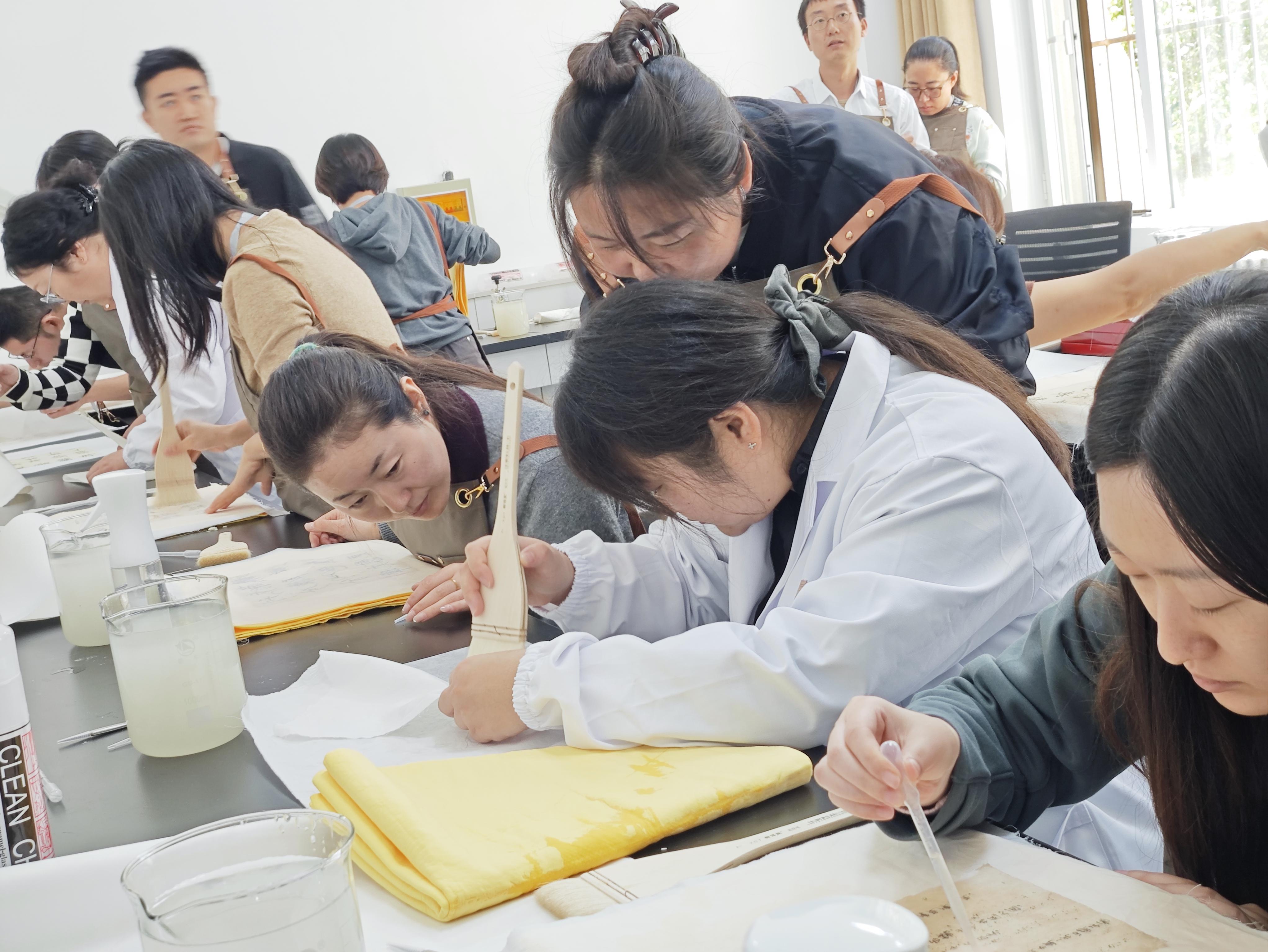 为了达到系统教授纸质文物前沿保护理念、核心修复技术及科学研究方法,构建科学规范的保护体系的目标,培训邀请复旦大学、故宫博物院、南京博物院、首都博物馆等专家学者进行授课。除古书画装裱修复技艺、纸质文物分析检测、书画装裱修复材料研究等理论课程外,还有文书修复、书画装裱等实践课程。教学之余研修班成员还进行了分组讨论,分享各自学习与工作中的问题与收获。