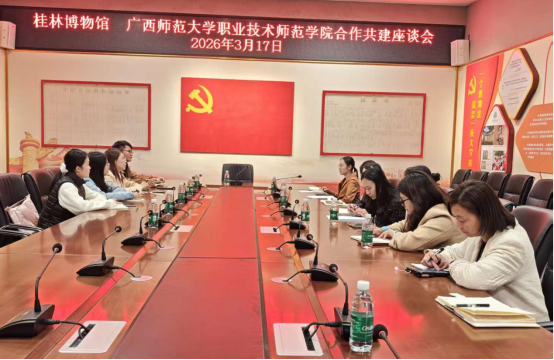 为深入挖掘地方文化与红色资源的育人价值,推动馆校资源共享、优势互补,近期桂林博物馆先后与广西师范大学职业技术师范学院、桂林师范学院开展馆校共建洽谈,围绕馆校协同发展相关事宜深入交流探讨。3月17日,桂林博物馆与广西师范大学职业技术师范学院召开合作共建座谈会。桂林博物馆副馆长王莹莹及馆内相关部门负责人,与该校唐瑗彬、陆英运教授一行参会,双方围绕学术研究、博物馆研学、文旅策划、实习实训、文创开发等领域的合作共建事宜充分交换意见。3月25日,桂林师范学院马克思主义学院党委书记罗莹一行到访桂林抗战文化名人博物馆,在参观专题陈列后,与博物馆相关负责人开展座谈,围绕红色资源活化利用、思政实践教学、学术研究协同、人才共育共享等议题深入交流。座谈中,桂林博物馆介绍了馆藏展陈、社会教育成果及红色育人阵地建设情况,桂林师范学院马克思主义学院相关领导表示,将充分发挥学科与人才优势,与博物馆深化联动合作,共同打造特色育人品牌。双方就资源共享、实践育人、学术研究、文创研发等方面达成了初步合作意向。撰稿:毛羽、刘莹拍摄:蔡靖雯、阳子婧
